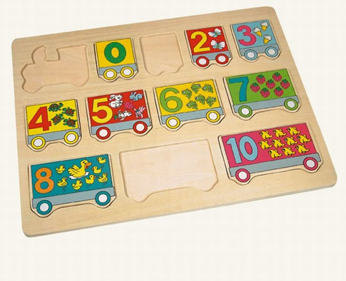 Deskové puzzle vláček - vkládačka rozvíjí nejen koordinaci očí a rukou, ale tato je určena navíc k pochopení číselné řady od 0 do 10 a učí hravou formou jednoduché počítání a pochopení většího a menšího počtu. Velikost každého vagónku odpovídá množství obrázků a velikosti uvedeného čísla. číst celé