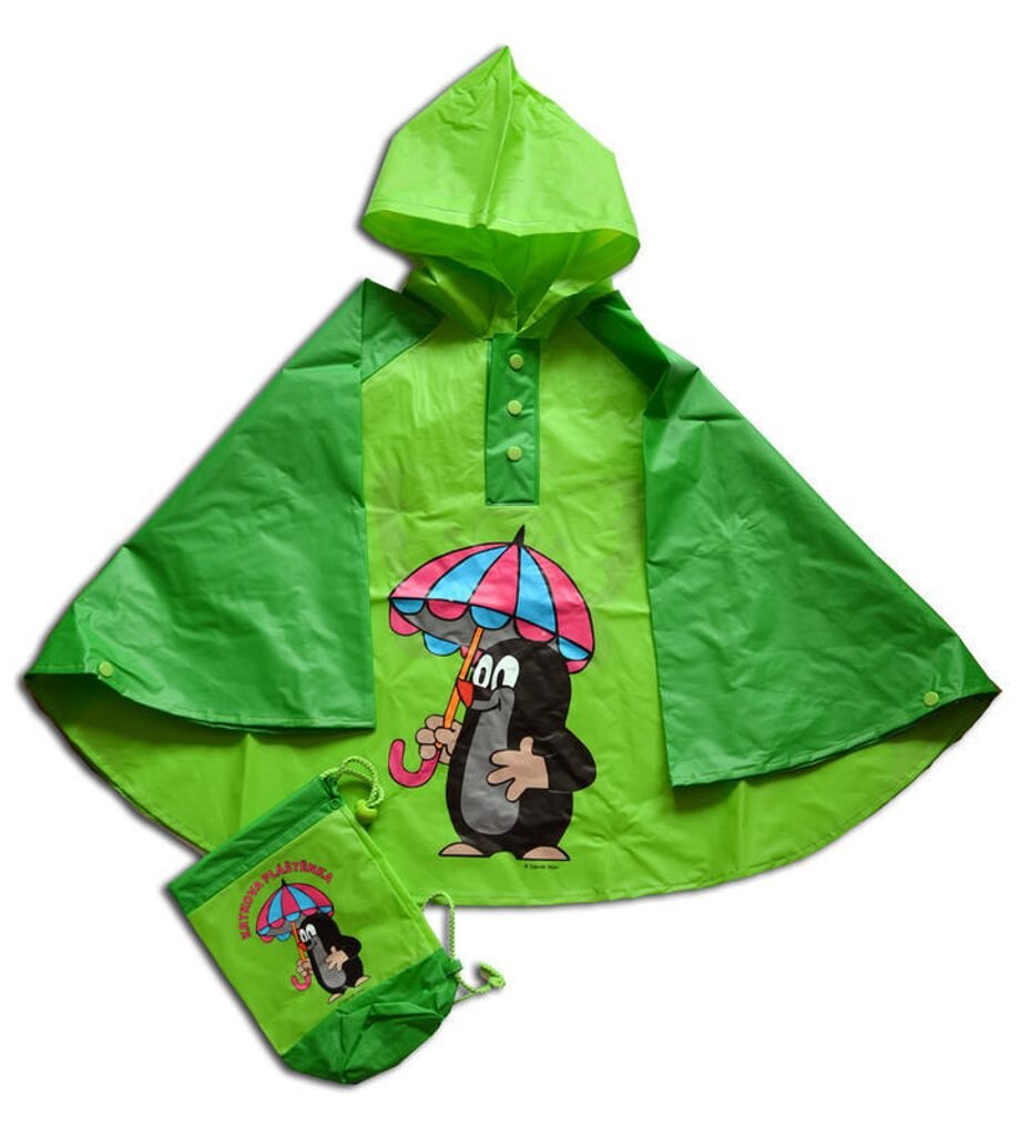 Dětská pelerína s motivem Krteček, vyráběná v barvách modrá, žlutá, zelená a růžová. Součástí poncha je i pytlíček na její uložení. Vyrobeno z materiálu PEVA, jehož výhodou je nižší hmotnost oproti PVC, odolnost proti nižším teplotám a recyklovatelnost. číst celé