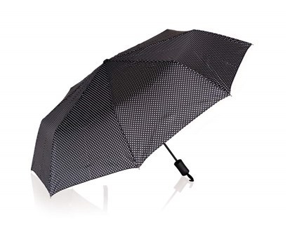 Deštník skládací 52 cm v černé barvě s puntíky, slouží k ochraně proti dešti a přímému slunci. Je vyroben z nepromokavého materiálu polyester. Má ochranu proti poškození větrem, automatické otevíraní a je skládací pro snadné uskladnění. číst celé