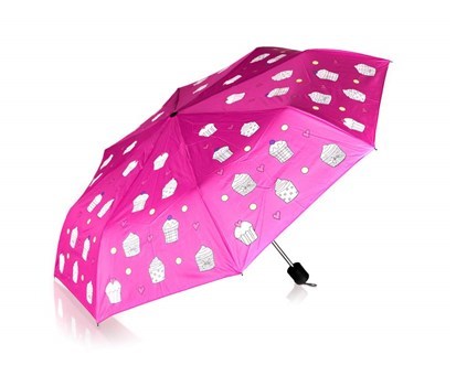 Deštník skládací 52 cm v růžové barvě s dorty, slouží k ochraně proti dešti a přímému slunci. Je vyroben z nepromokavého materiálu polyester. Při namočení mění barvu obrázků.