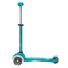 Dětská koloběžka Mini Micro Deluxe Aqua má tyrkysovo-mátovou barvu a proto jí mají v oblibě převážně chlapci. Má tyrkysové rukojeti, metalickou tyrkysovo-mátovou řídící tyč a tyrkysovou nášlapnou desku s mátovým nápisem Micro.