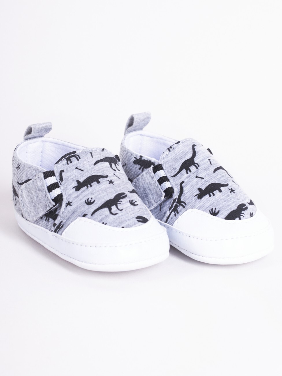 Śliczne chłopięce buciki w kolorze jasno - szarym z motywem ukochanych przez dzieci dinozaurów. Wspaniale sprawdzą się do codziennych stylizacji.