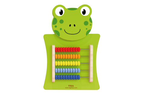 Dřevěná nástěnná hra s motivem žáby. Velikost cca 36 x 55 x 4,5 cm. Jedná se o nástěnné počítadlo. Rozměry balení cca 38,5 x 57 x 5,5 cm. Věk 18m+