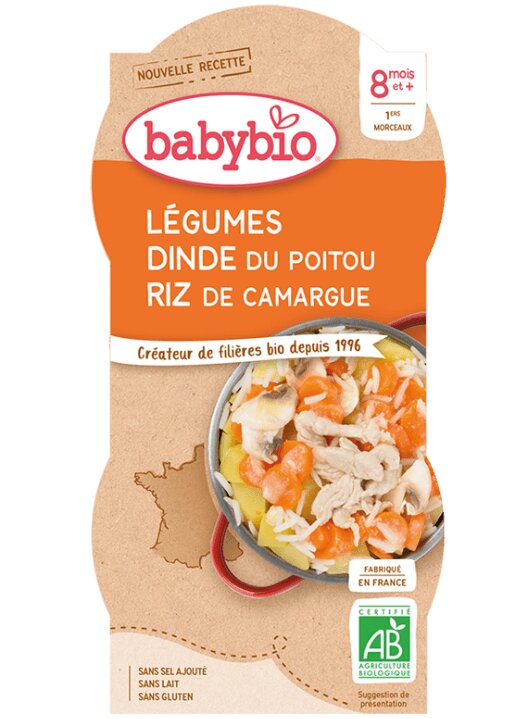 Bio výživa pro kojence od ukončeného 8. měsíce. Lahodný recept v praktickém balení! Organické menu Babybio s malými kousky se pečlivě připravuje v páře z ekologicky pěstovaných surovin. Neobsahuje sůl ani zahušťovadla. A díky malým kouskům se dítě může pomalu učit jíst samo. Výrobek ekologického zemědělství. Určeno pro zvláštní výživu kojenců a malých dětí. Bez přidaného cukru. Bez palmového oleje. Bez přidané soli. Bez chemických konzervačních látek, dochucovadel, zahušťovadel a barviv. Garance Babybio: Ekologická výživa pro kojence. 25 let odborných zkušeností. Známý původ surovin. Receptury vyvíjené ve spolupráci s francouzskými pediatry a nutričními odborníky. Vyrobeno ve Francii. Baleno v ochranné atmosféře. Obaly neobsahují BPA. Každá nově vyrobená výrobní šarže podléhá laboratornímu rozboru přímo u výrobce, než je uvolněna do prodeje.