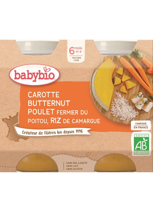 Bio výživa pro kojence od ukončeného 6. měsíce. Prvotřídní chuť v jedné skleničce! Mrkev pěstovaná v písčité půdě oblasti Landes, máslová dýně z Provence, farmářské kuře z Poitou a špetka tymiánu zaručují skvělý zážitek k obědu nebo k večeři.
