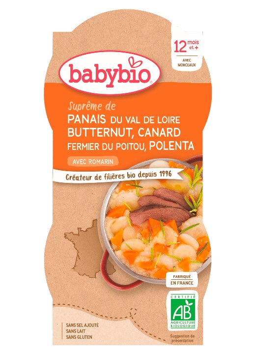 Bio výživa pro kojence od ukončeného 12. měsíce. Hlavní roli v tomto skvělém příkrmu hraje farmářská kachna z Francie, doplněná prospěšným pastinákem a máslovou dýní. Nechybí ani polenta a rozmarýn. Vše připravené na páře - vitamíny a skvělá chuť jsou zaručeny.