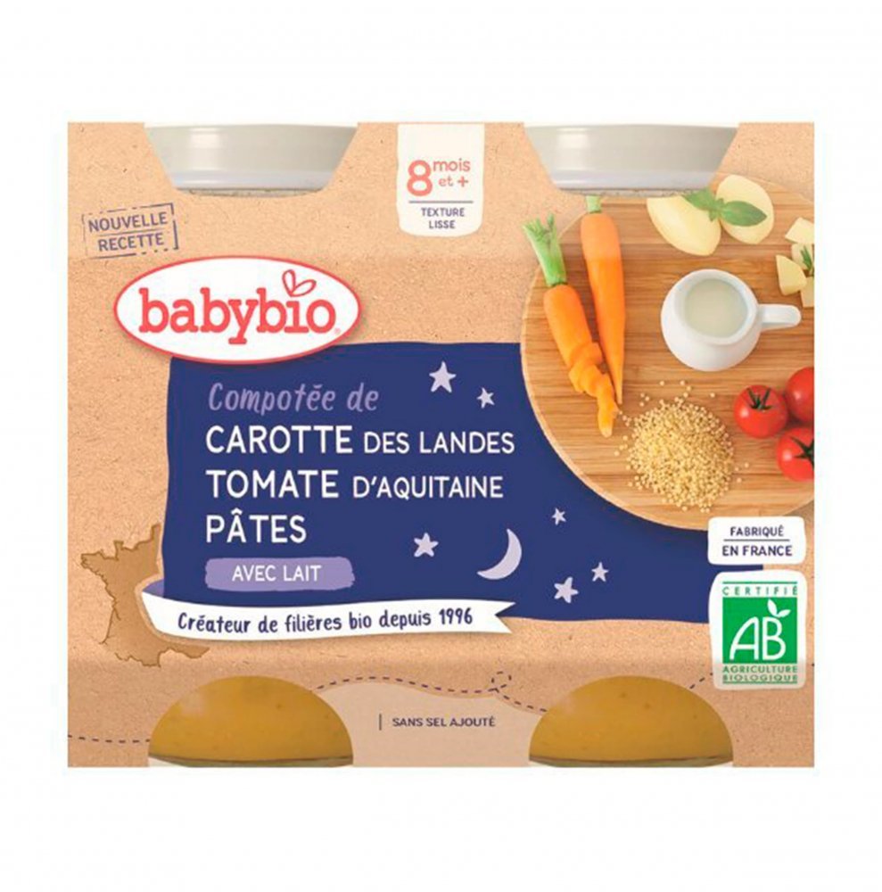 Představte svému dítěti příkrm plný fantazie! Mrkev z oblasti Landes, brambory a pravá italská rajčata doplněná těstovinami, francouzskou bazalkou a rozmarýnem. Pro tu nejlepší konzistenci je přidána špetku odstředěného mléka. Díky tomu je příkrm ještě chutnější.