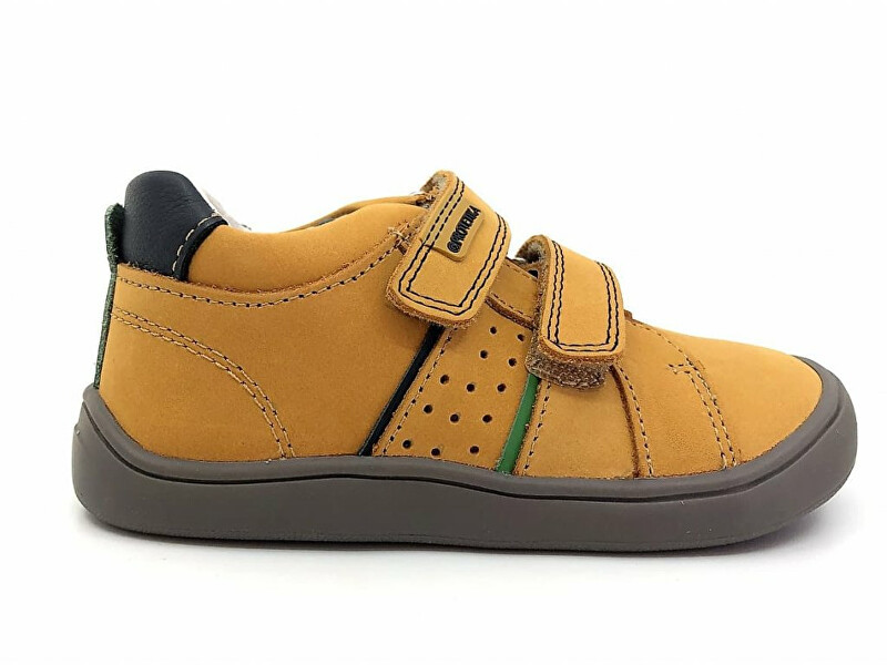 Dětská barefootová vycházková obuv Rasel beige má ohebnou gumovou podrážku v praktické šedé barvě s jemným vzorkem. Obuv je vyrobena z hladké kůže v krásné hořčicové barvě s modrými detaily.