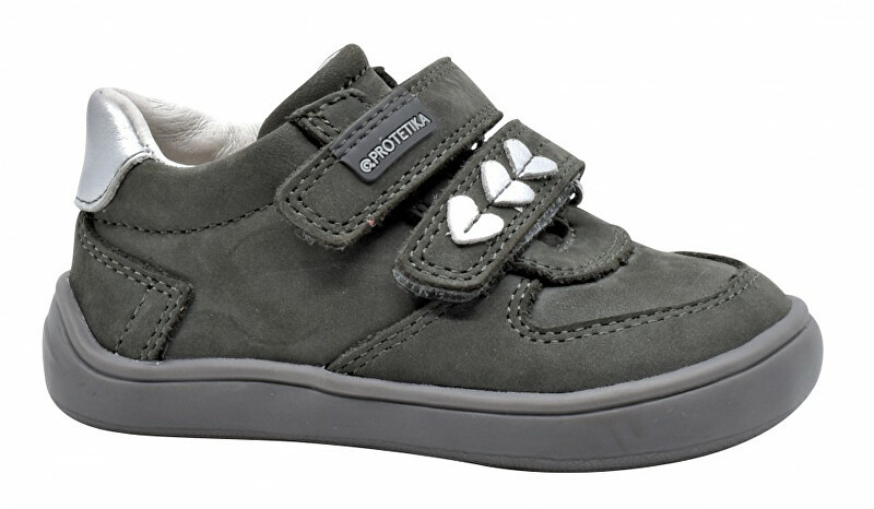 Dětská barefootová vycházková obuv Kerol grey má ohebnou a měkkou podrážku. Podešev má šedou barvu která je po celém obvodu jemně vyvýšená. Svršek je z šedé kůže typu nubuk. Prošití koresponduje s barvou kůže. Vnitřek je vystlaný kůží bílé barvy. Ze stejné kůže je i stélka. Ta je vyjímatelná a rovná. Zapínání je na dva suché zipy. Na jedné přezce se jsou našitá tři srdíčka stříbrné barvy.
