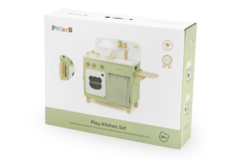 Dřevěná kuchyňka s doplňky. Balení obsahuje zrcadlový odsavač par, sporák s hrncem a pánvičkou, troubu, dřez, skříňku se závěsem, slánky s pepřenkou a jiné menší doplňky. Rozměry balení cca 59x47x15 cm. Rozměry výrobku 72,9x30x64,1 cm. Věk 3+ číst celé