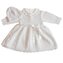 Souprava se skládá ze šatů a čepice, které jsou vyrobené z pleteniny s ozdobným ažurovým vzorem a ozdobnou stuhou.