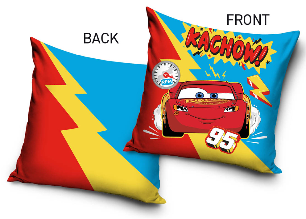 Velikost povlaku je 40x40 cm a praktické zipové zapínání umožňuje snadné snímání i nasazování povlaku. Oboustranný design nabízí dva různé vzory - na jedné straně je typické červené závodní auto Blesk McQueen se svým přátelským mrknutím "čau, čau" a na druhé straně originální motiv, který dodá dětskému pokoji pestrost.