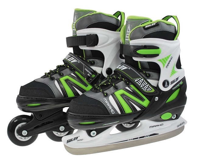Chlapecké nastavitelné brusle s vyměnitelným podvozkem na lední nebo in-line bruslení. Rychleschnoucí prodyšná výstelka pro pohodlné nošení. Brusli lze jednoduše nastavit dle potřeby na 4 velikosti pouhým stisknutím tlačítka na boku v patě brusle.