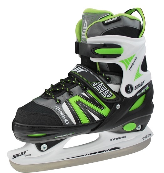 Chlapecké nastavitelné zimní brusle. Rychleschnoucí prodyšná výstelka pro pohodlné nošení. Brusli lze jednoduše nastavit dle potřeby na 4 velikosti pouhým stisknutím tlačítka na boku v patě brusle.