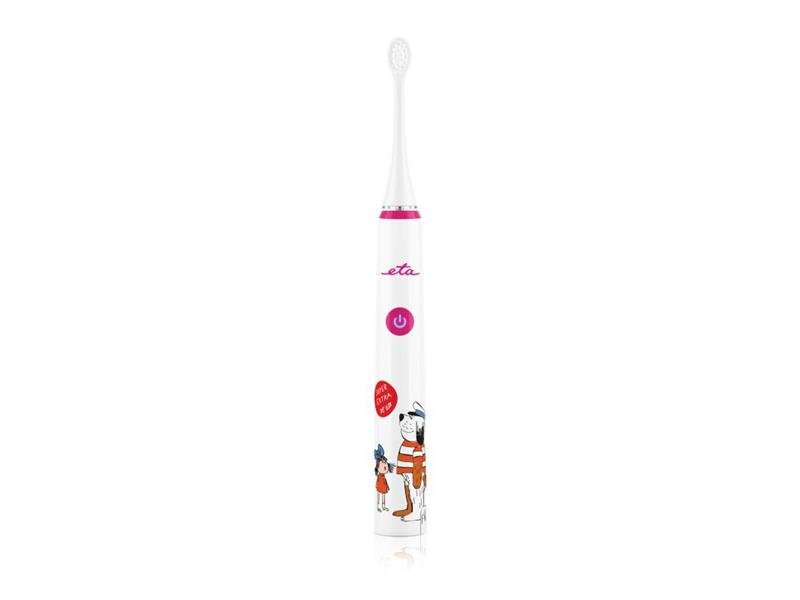 Sonický zubní kartáček pro děti. ETA Sonetic Kids 0706 90010, nabíjecí nabízí až 42 000 pohybů/min, 4 režimy čištění, časovač na 2 minuty a dobu provozu až 80 minut na jedno nabití. Součástí balení jsou 2 hlavice a USB kabel.