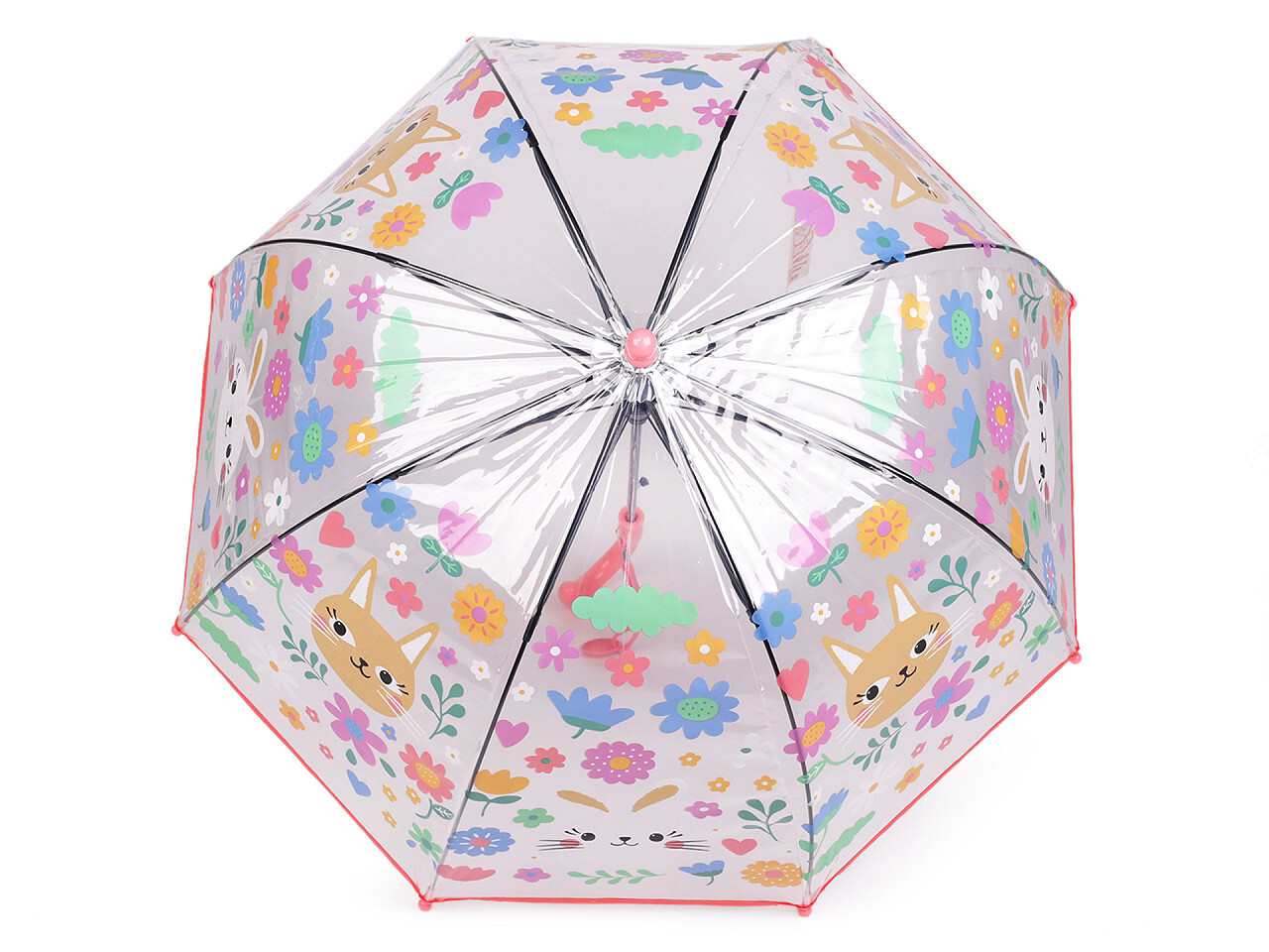 Dětský průhledný vystřelovací deštník je ideální volbou pro malé dobrodruhy, kteří chtějí zůstat chráněni a zároveň si užít pohled do okolí. Je nejen praktický, ale i zábavný díky barevnému potisku s květinami a roztomilými zvířátky.