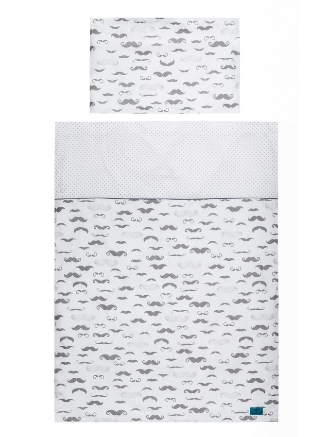 Dětská bavlněná 6-dílná souprava do postýlky Belisima Little Man pro miminka. Soupravu zdobí originální obrázký knírů a příjemné barvy. Je vyrobena z měkkého, příjemného materiálu. Souprava obsahuje povlečení na polštářek cca 40x60 cm, povlečení na peřinku cca 90x120 cm, mantinel cca 180 cm, výplň polštářek a peřinka, nebesa. Materiál 100% bavlna.Tyto výrobky jsou bezpečné, protože:- přírodní bavlna nezpůsobuje odřeniny a podráždění, jelikož neobsahuje formaldehydy a další prvky, které kojencům škodí- neztrácí barvu a nezabarvuje oblečení- nabízené vzory jsou příjemné na pohled a mají uklidňující barvy- zipy používané u povlečení jsou tzv. "bezpečné zipy" bez volně visící koncovky, kterou by mohlo dítě utrhnout a spolknout- nejsou použity žádné knoflíky ani žádné další plastové nebo ocelové části, které mohou být pro Vaše dítě nebezpečné- materiál, který je používán pro výplně polštářů a přikrývek, je 100% protialergický, což znamená, že se v jeho vláknech nešíří žádné mikroorganismy ani plíseň.