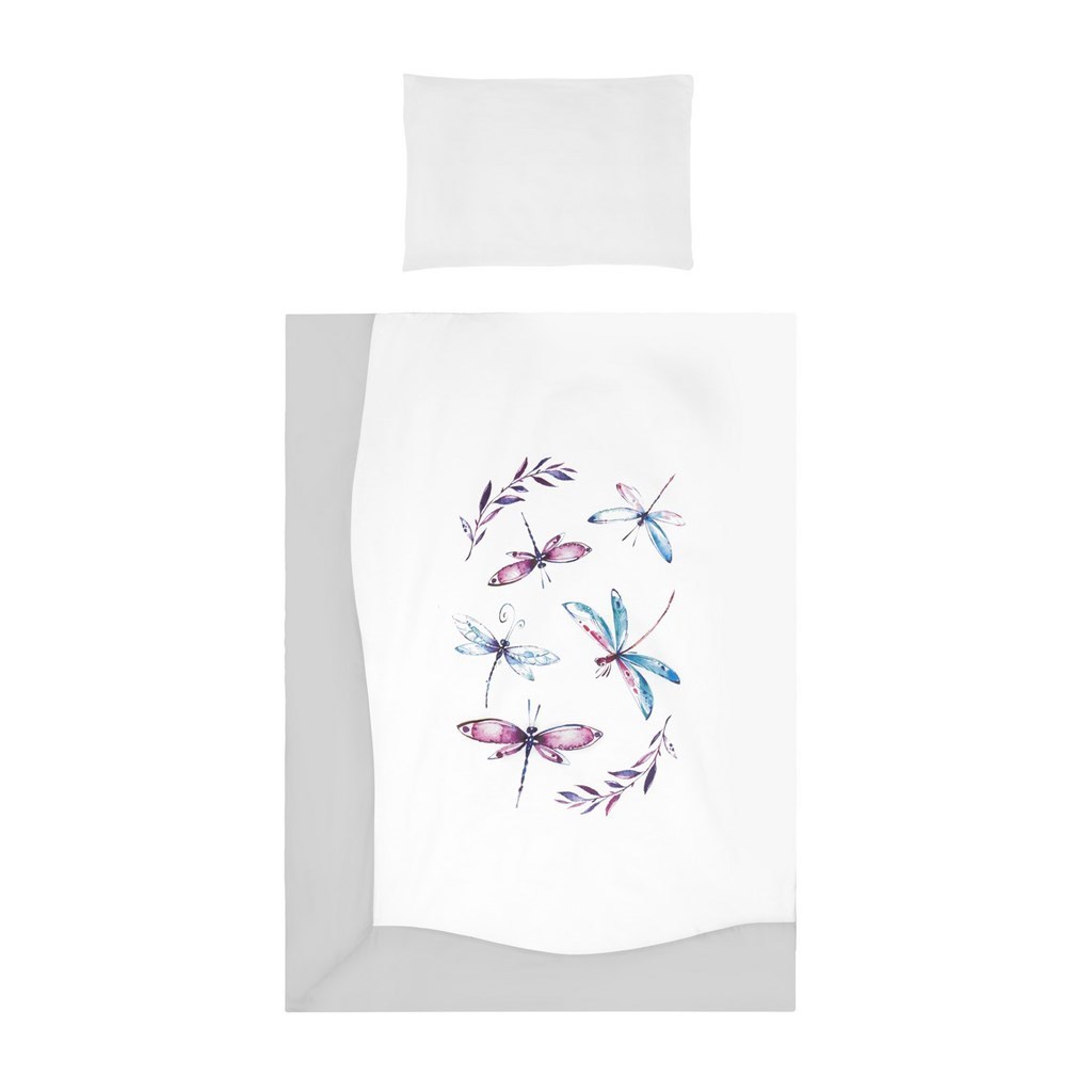 Krásná dětská bavlněná 5-dílná souprava do postýlky Belisima Vážky pro miminka. Souprava je zdobena krásnými barevnými vážkami. Je vyrobena z měkkého, příjemného materiálu. Souprava obsahuje povlečení na polštářek cca 40x60 cm, povlečení na peřinku cca 100x135 cm, mantinel cca 180 cm, výplň polštářek a peřinka. Materiál 100% bavlna.Tyto výrobky jsou bezpečné, protože:- přírodní bavlna nezpůsobuje odřeniny a podráždění, jelikož neobsahuje formaldehydy a další prvky, které kojencům škodí- neztrácí barvu a nezabarvuje oblečení- nabízené vzory jsou příjemné na pohled a mají uklidňující barvy- zipy používané u povlečení jsou tzv. "bezpečné zipy" bez volně visící koncovky, kterou by mohlo dítě utrhnout a spolknout- nejsou použity žádné knoflíky ani žádné další plastové nebo ocelové části, které mohou být pro Vaše dítě nebezpečné- materiál, který je používán pro výplně polštářů a přikrývek, je 100% protialergický, což znamená, že se v jeho vláknech nešíří žádné mikroorganismy ani plíseň.