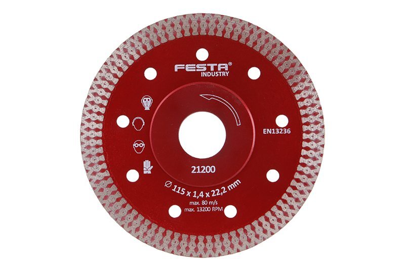profesionální diamantový turbo kotouč FESTA INDUSTRY - extra tenký jen 1,4 mm kvalitní diamantová vrstva se speciálním tvarem segmentů a vysokým obsahem diamantového prachu -rychlé a přesné řezání, dlouhá životnost přesné zpracování - napojení na nosný disk kotouče odolávající vysokým teplotám, chladící otvory v těle kotouče pro maximální chlazení kotouče při práci, zesílený střed - vyšší pevnost konstrukce kotouče s nižším přenosem nežádoucích vibrací určený pro mokré i suché řezání dlažby, obkladů, betonu, cihel, zdiva, žuly, mramoru, kamene Instruktážní video
