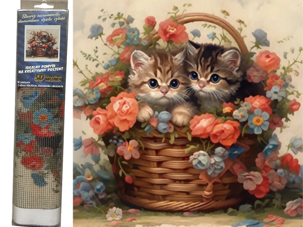 Hotový obraz 30 x 40 cm s motivem dvou koček v košíku zdobí váš interiér originálním a jiskřivým uměleckým dílem, které můžete jednoduše zarámovat a pověsit na zeď.