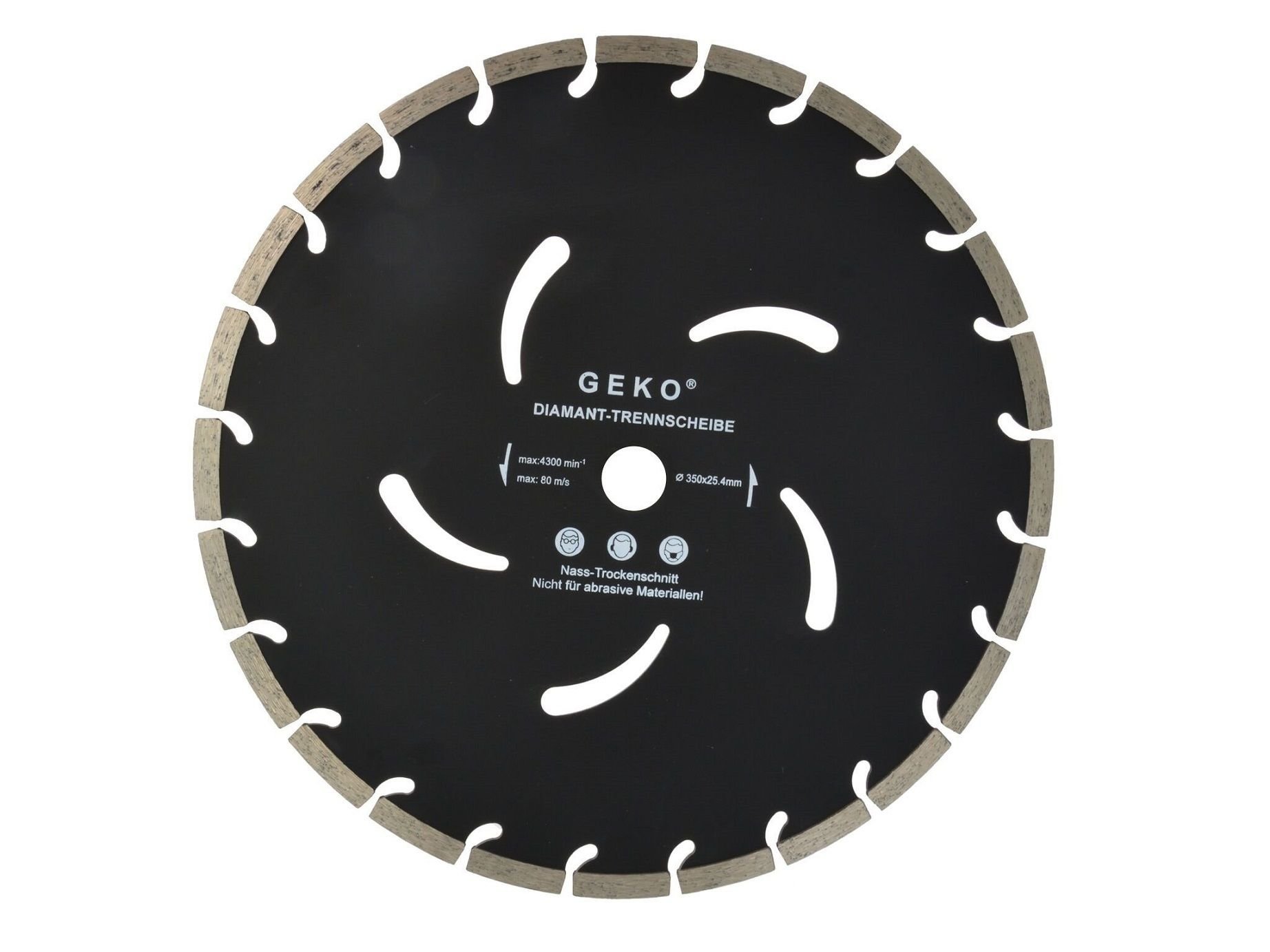 Precizní diamantový řezný kotouč GEKO s přerušovaným diamantovým segmentem po celém obvodu (s drážkami, výřezy), který je rozdělený na určitý počet užších segmentů. Tyto výřezy kotouč během řezání chladí a vynáší obroušený materiál z řezu ven. Segmentový kotouč se hodí pro hluboké řezání tvrdých stavebních materiálů jako je např. beton, železobeton, asfalt, zdivo, kámen apod., vytváří širší řez a může štípat okraje. Se segmentovým kotoučem je možné řezat za mokra i za sucha.