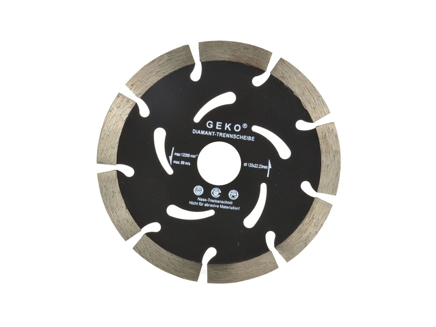 Precizní diamantový řezný kotouč GEKO s přerušovaným diamantovým segmentem po celém obvodu (s drážkami, výřezy), který je rozdělený na určitý počet užších segmentů. Tyto výřezy kotouč během řezání chladí a vynáší obroušený materiál z řezu ven. Segmentový kotouč se hodí pro hluboké řezání tvrdých stavebních materiálů jako je např. beton, železobeton, asfalt, zdivo, kámen apod., vytváří širší řez a může štípat okraje. Se segmentovým kotoučem je možné řezat za mokra i za sucha.