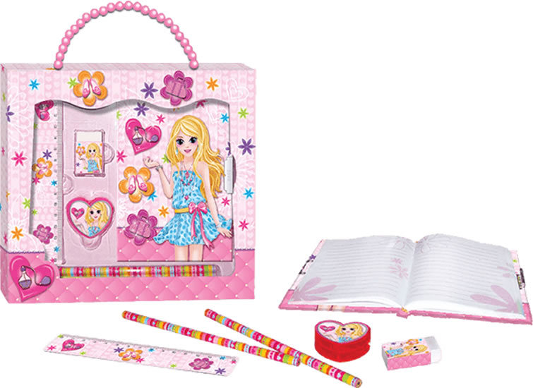 Dárková sada s diářem - dívka. Sada obsahuje: diář se zámkem, pravítko, gumu, ořezávátko a 2 tužky. číst celé