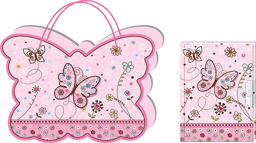 Diář se zámkem v taštičce - motýl. Růžová papírová taštička ve tvaru motýlka Diář - linkovaný, zámek číst celé