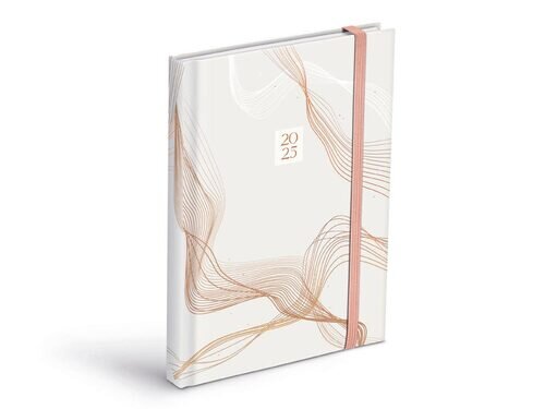 Denní diář pro rok 2025 ve formátu A5, ve světle šedé barvě, s elegantním abstraktním motivem a praktickým uzavíráním na gumičku. Povrch obálky je vyroben z lesklého lamina. Je skvělým pomocníkem pro efektivní organizaci vašeho času. číst celé