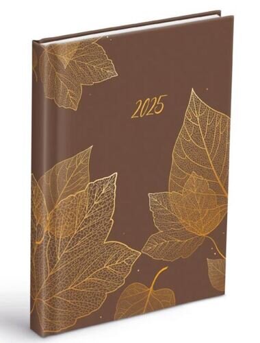 Denní diář pro rok 2025 ve formátu A5, v elegantní hnědé barvě s jemným zlatým motivem listů. Povrch obálky je vyroben z lesklého lamina, což dodává diáři moderní vzhled a zvyšuje jeho odolnost. Je ideálním pomocníkem pro efektivní organizaci vašeho času, takže budete mít své denní plány vždy...