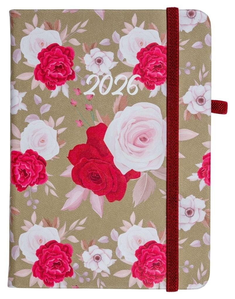 wewnątrz: plan roku i rozkład roku 2026, terminy ferii zimowych, święta oficjalne i zwyczajowe, podróże, protokół powypadkowy w przypadku stłuczki, notes, skorowidz teleadresowy, kalendarium dodatkowe na 2025-2026-2027 rok