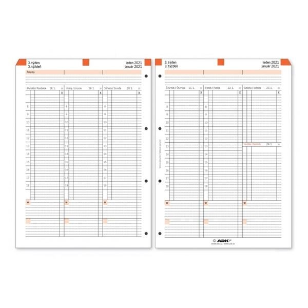 Termínovaný formulář pro týdenní plánování do diářů ADK formátu A4;Celý týden na jeden pohled;Dny řazené do sloupců;Levá strana od mechaniky: pondělí - středa;Pravá strana od mechaniky: čtvrtek - neděle;Rozměry 29,5 x 21 cm