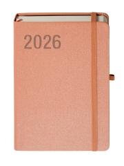 Kolekcja: Sakura , Format: A5, wymiary okładki: 210x145 mm, układ: tydzień na stronie, ilość stron: 144, oprawa: twarda, materiał: skóra ekologiczna, gramatura papieru: 80g, kolor papieru: off white, dodatki: plan roku 2026, ważne wydarzenia, skorowidz adresowy, notatki, pionowa gumka zamykająca: w kolorze okładki, wstążka: w kolorze okładki, gumka na długopis: w kolorze okładki, zaokrąglone rogi: tak, wyklejka: kremowa, koperta: tak