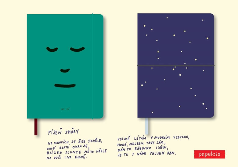 Diář 2017 vznikl (již po čtvrté) v osvědčené spolupráci s Papelote. Můžete si vybrat z dvou variant. Za prvé zelený diář s obličeji, který je inspirovaný knihou O smrti smrťoucí. Za druhé je to diář barvy noční oblohy se žlutými hvězdami. Obě dvě varianty obsahují týdenní diář, kdy na levé straně naleznete dny v týdnu a na pravé místo na vaše poznámky, kapsičku na drobné písemnosti, záložku, pravítko, pohled. Diáře mají gumičku, lze je tedy mít vždy perfektně zavřené. Různé motivy - náhodný výběr