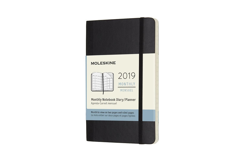 Měsíční plánovací diář na rok 2019. Měsíc je zobrazen na dvou stránkách, po kterých následují dvě linkované stránky. Na konci je 51 linkovaných stránek na poznámky. Diář má měkkou, ve hřbetu šitou vazbu. Obepíná ho pružná páska proti samovolnému otevírání. Obsahuje praktickou vnitřní kapsu, textilní záložku, 289 barevných samolepek a leták s historií Moleskine. Papír s gramáží 70 g/m2, neobsahuje kyseliny.