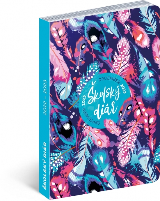 Školský diár s obrázkami pierok obsahuje prehľad na rok 2022 a 2023, slovenské týždenné riadkové kalendárium s menami a sviatkami, rozvrh hodín, priestor na poznámky. Kalendárium začína v septembri 2022 a končí v decembri 2023.