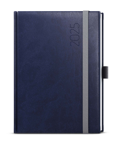 Denní diář v modré barvě z jemné vivelly ve formátu A5 s praktickou gumičkou a poutkem na propisku. Má velký prostor pro poznámky a plánování.