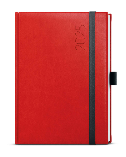 Denní diář v červené barvě z jemné vivelly ve formátu A5 s praktickou gumičkou a poutkem na propisku. Má velký prostor pro poznámky a plánování.