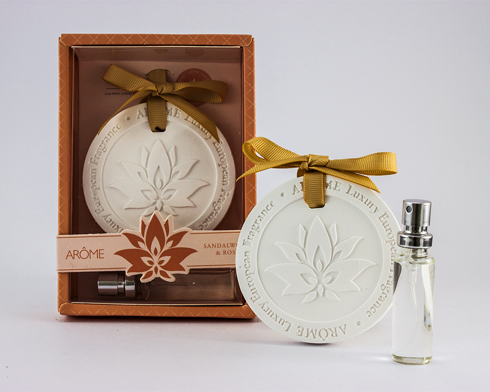 Jílový aroma difuzér má jemnou a vyváženou vůni santalového dřeva a růží. Součástí balení je i krásný jílový talířek s reliéfem Arome, který vůni postupně uvolňuje do místnosti. Celý set je zabalen do dárkové krabičky se stužkou, která jistě Vašim blízkým udělá radost.
