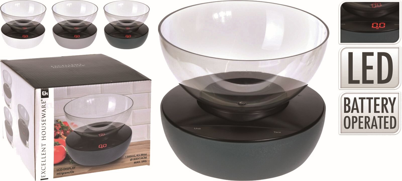 Kuchyňská digitální váha s displejem a transparentní odnímatelnou miskou, s možností vážit v kg, g, a oz až do 5 kg. Možnost vynulování a dovažování funkcí TARE. Miska o objemu 1300 ml. Rozměry - průměr 18 cm, výška 14 cm.
