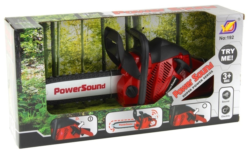 Zabawkowa, dobrze odwzorowana piła łańcuchowa. Generuje efekty świetlne. Ma obrotowy łańcuch z gumy. Wystarczy nacisnąć odpowiedni przycisk, a wprawimy go w ruch. Zabawka wydaje dźwięki, które imitują prawdziwe działanie piły. Duży uchwyt ułatwia jej trzymanie. Wygodna rączka z przyciskami zwiększa komfort użytkowania. Napisy PowerSound uzupełniają realistyczny projekt zabawki. Piła jest lekka. Jest to idealny prezent dla chłopca.Baterie: 3xAA (brak)Wymiary opakowania: 39x10x20cmWiek: 3+