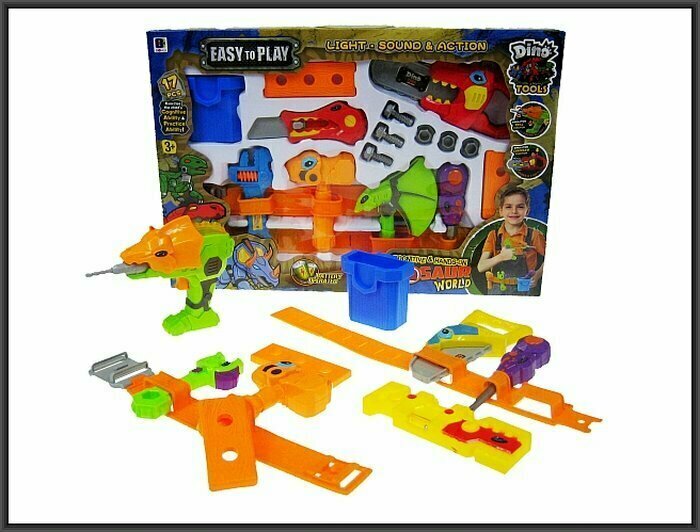 Zestaw 17 plastikowych narzędzi dla małego majsterkowicza.Posiada efekty dźwiękowe i świetlne.Wiele narzędzi zostało stylizowanych na dinozaury. baterie: 4 x AG13 LR44 (w zestawie). Wymiary opakowania: 33,5 x 49,5 x 6,5 cmWiek: 3+