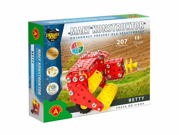 Prasa do siana wchodząca w skład serii maszyny rolnicze. Zabawka może służyć jako pojedynczy model do zabawy, albo wraz z traktorem (model Fred) stać się podstawą do zbudowania całego parku maszynowegoniezbędnego do pracy na gospodarstwie. W serii maszyny rolnicze ukazały się następujące modele: Emily (talerzówka), Stinky (rozrzutnik obornika), William (pług obrotowy), Jacob (opryskiwacz), Helen(zgrabiarka). Mały Konstruktor to seria zabawek do samodzielnego montażu, rozwijająca zdolności manualne oraz wyobraźnię przestrzenną. Każdy model składasię z elementów metalowych o różnej wielkości i kształtach, a także jest wzbogacony kolorowymi elementami z tworzyw sztucznych. Dzięki dołączonemu zestawowi narzędzi, można zbudować wyjątkowy pojazd zgodnie ze wskazaniami instrukcji lub wedle własnej wyobraźni. To idealny wstęp do rozbudzenia w dziecku pasji inżyniera. Zabawka która łączy pokolenia, zachęcając do wspólnego majsterkowania.Zawartość opakowania: 207 elementów zabawki, narzędzia do montażu, instrukcja.Wymiary opakowania: 24,5 x 21,5 x 5 cmDla dzieci w wieku: 8+
