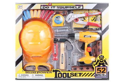 Sada nářadí pro malé kutily obsahuje vrtačku, klíč, kladivo, šroubovák, kleště, metr, helmu, brýle, 9 šroubů a další doplňky. Rozměr balení cca 46 x 38 x 6 cm. Věk 3+ číst celé