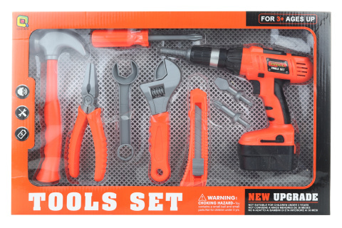 - Sada obsahuje: vrtačku na baterie, kladivo, šroubovák, klíč, kleště a nůž
