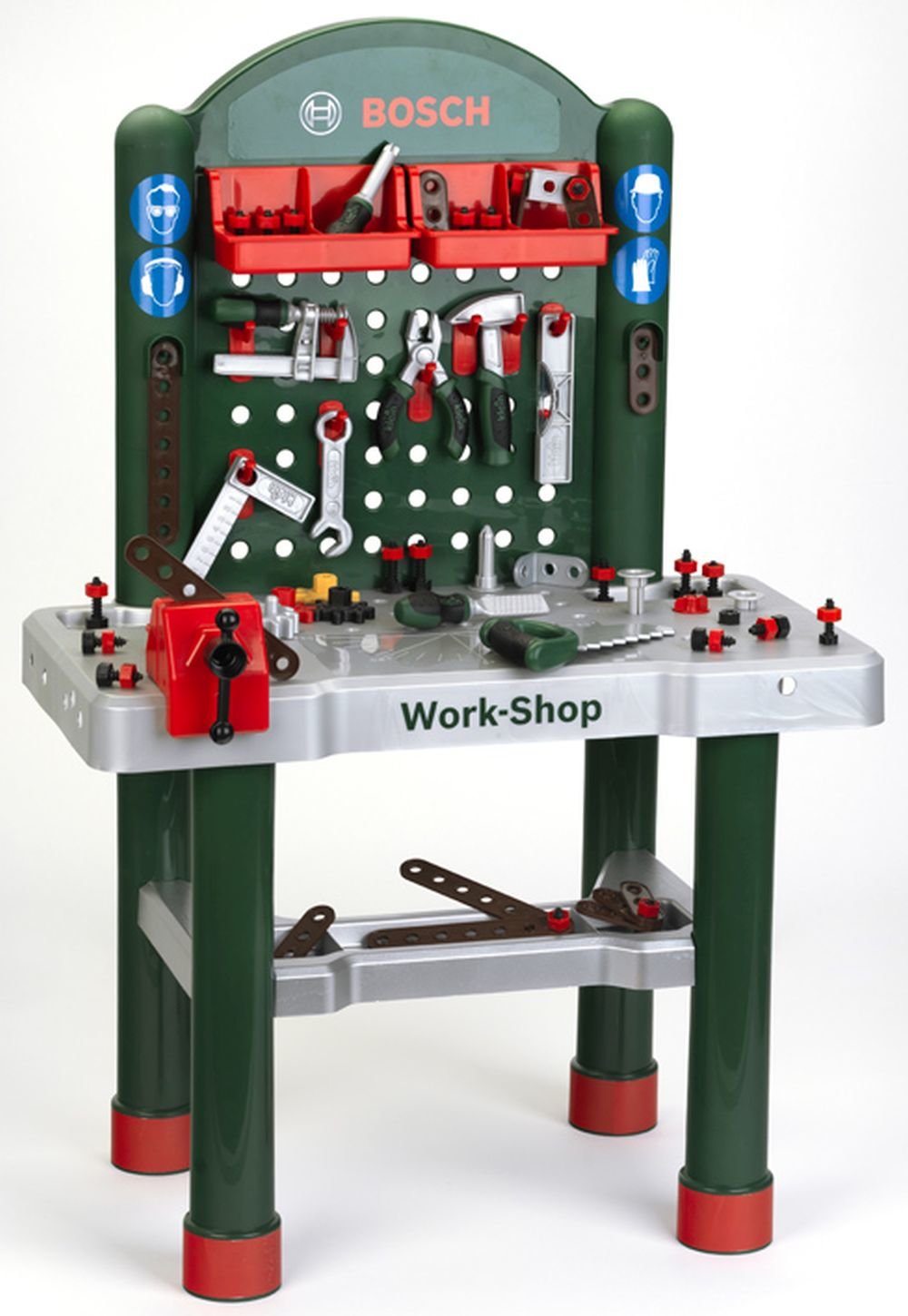 Pracovní stůl v licenci BOSCH nesmí chybět v dílně žádného kutila. Stůl obsahuje 82 doplňku včetně pracovní desky, svěráku, třech úložných boxů a jednoho velkého, různé šrouby, matice, prkna a mnoho dalšího.. . Pracovní stůl je vhodný pro děti od 3 let.