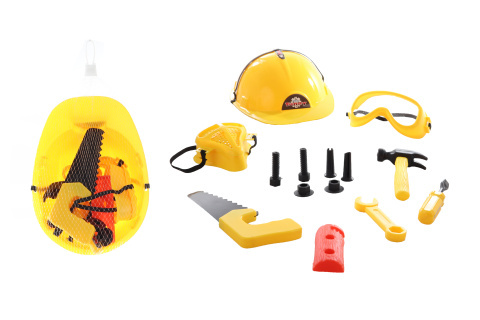 Sada obsahuje vše, co malý stavitel potřebuje: helmu, brýle, masku, pilku, kladívko, šroubovák, klíč, šroubky a imitaci dřeva. Vše je pečlivě zabalené v síťce pro snadné přenášení a úschovu. Tato sada je vhodná pro děti od 3 let, což z ní činí ideální hračku pro první experimentování s prací s nářadím.