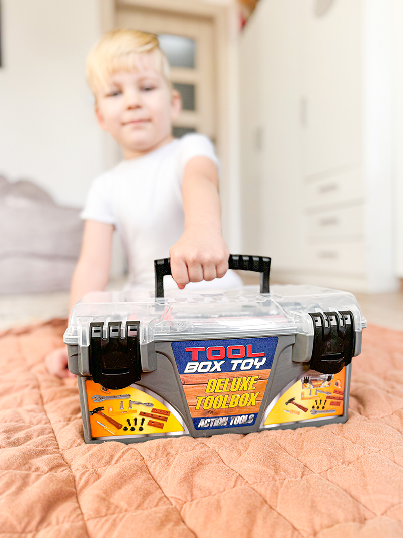 Plastový kufřík plný nářadí. Pilka, kleště, šroubovák, kladívko, šroubky, …...prkýnka, která jdou šrouby přimontovat k sobě. Vše uloženo v přenosném kufříku. Hračka rozvíjí dětskou motoriku. číst celé