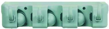 Plastový držák úklidových pomůcek - zajistí pořádek ve vaší úklidové komoře. 3 pozice pro uchycení mopu, smetáku, teleskopické tyče, atd. a 2 pozice na háčku pro zavěšení třeba smetáčku a dalšího vašeho nářadí. Celkem 5 pozic.Nářadí drží svou váhou upevněné kolečky které jsou potaženy gumou.