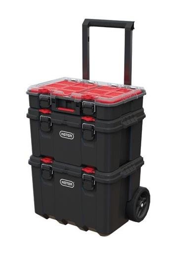 Využijte mobilní systém Keter s organizérem a vyjímatelnými boxy a uspořádejte do nich kromě velkého náčiní také šroubky, matice, vruty a další drobné pomůcky. Kovové západky zajistí pevné uzavření víka. Obsah boxů se vám tedy nevysype a zůstane v bezpečí. Teleskopické kovové madlo vám navíc zjednoduší manipulaci celého systému.